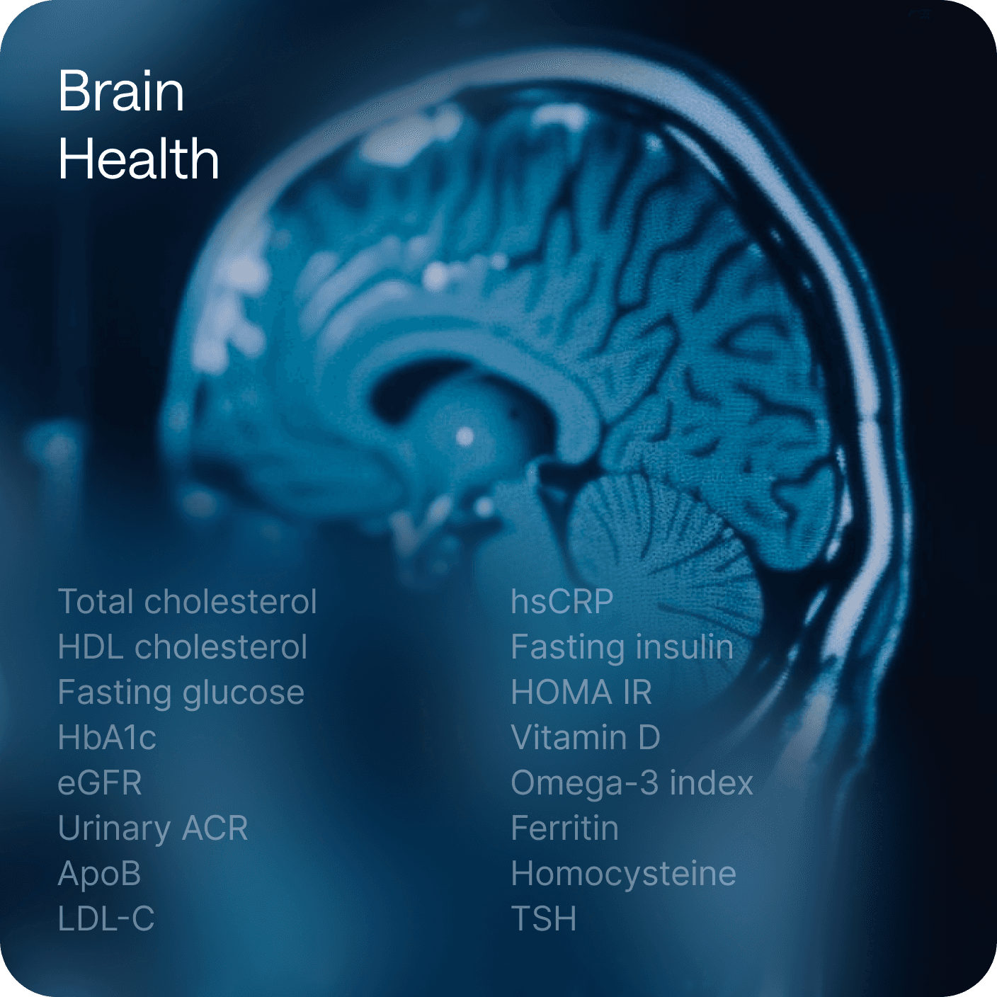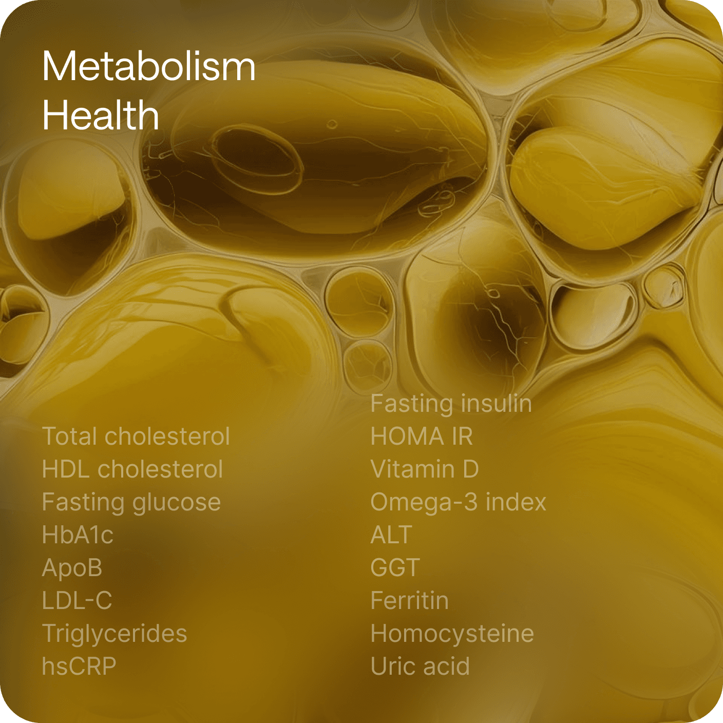 A structured, 360° view of your health — organized into eight clear areas so you always see the full picture.