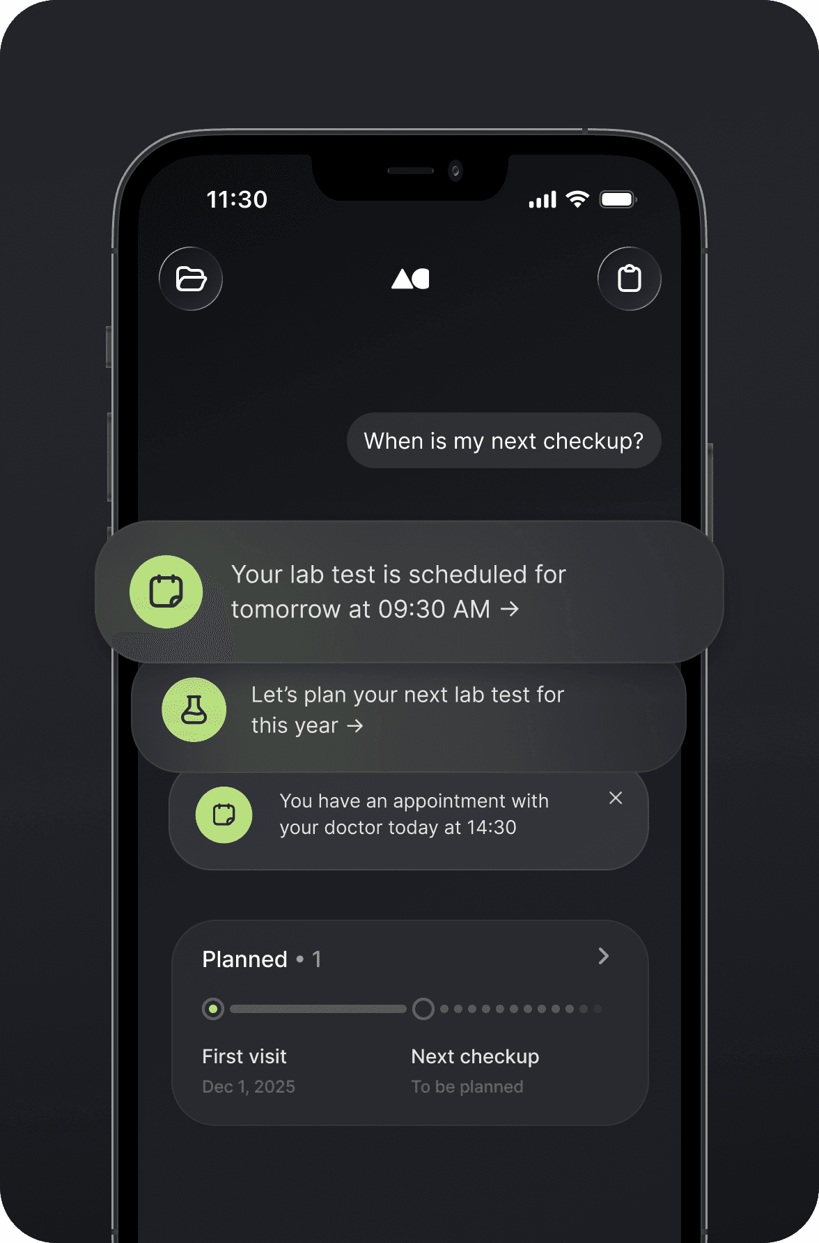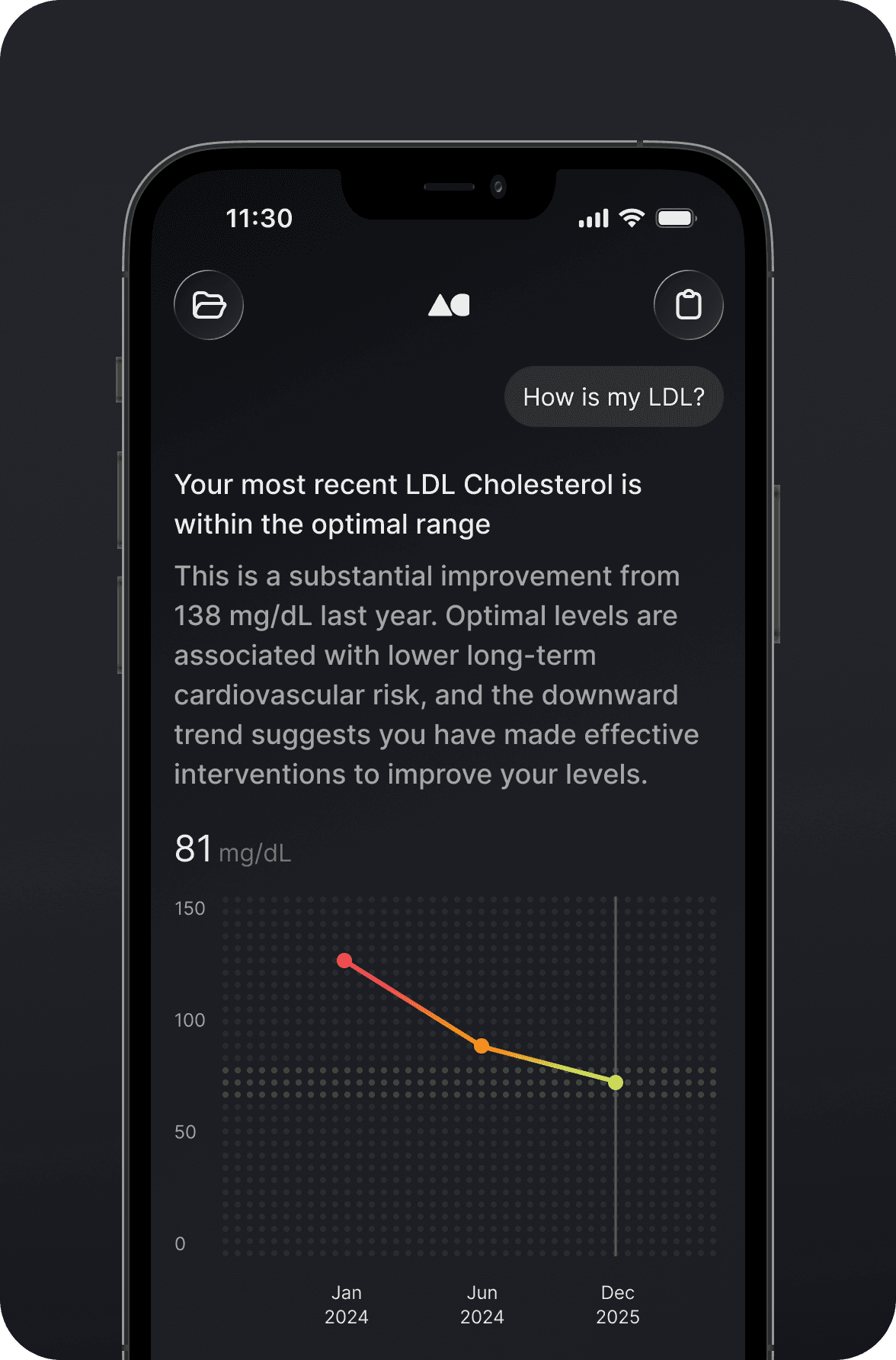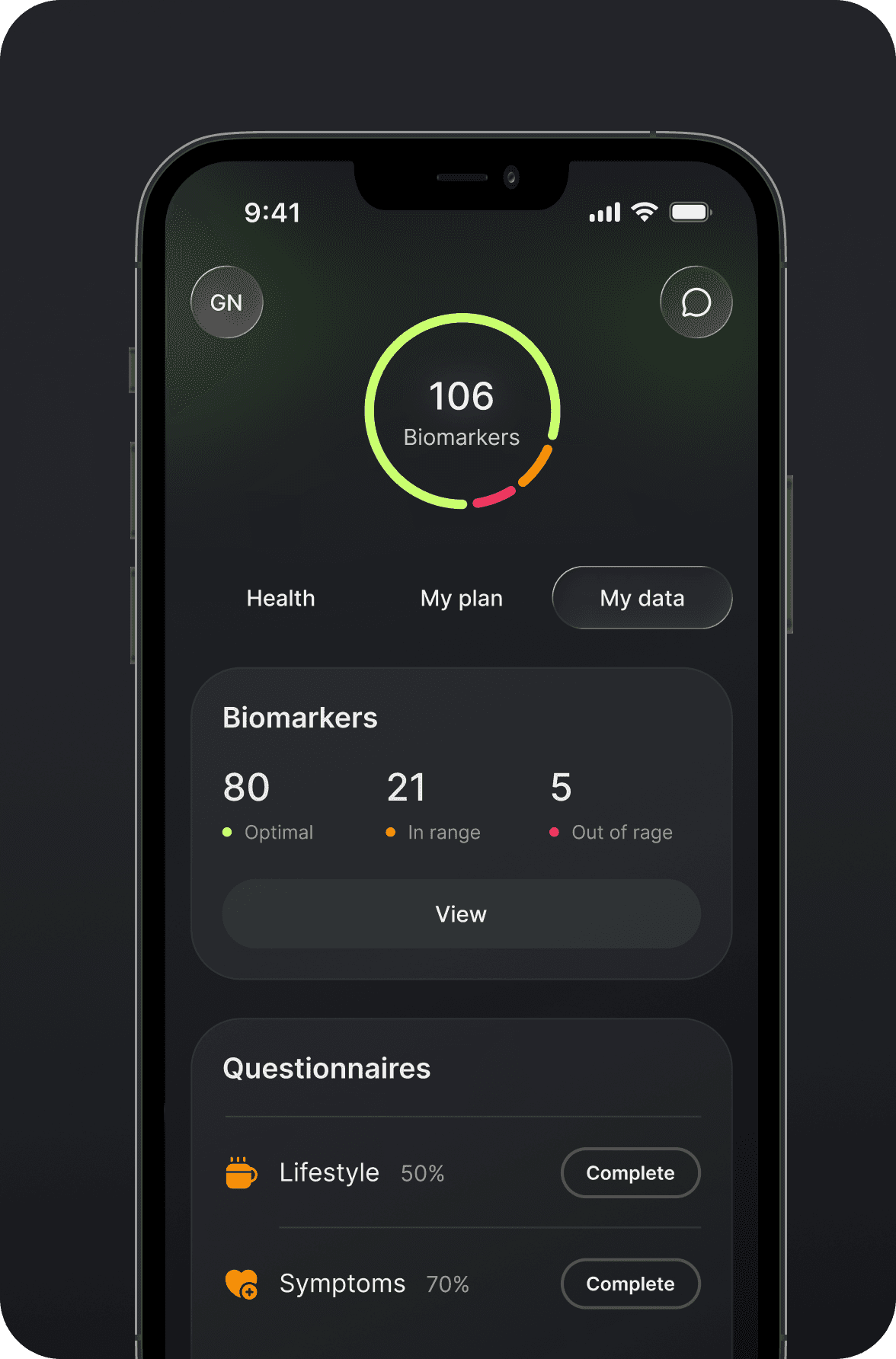 Biomarkers, medical history, and files — stored securely in one organized hub, so nothing gets lost and progress is easy to follow.